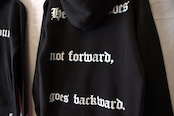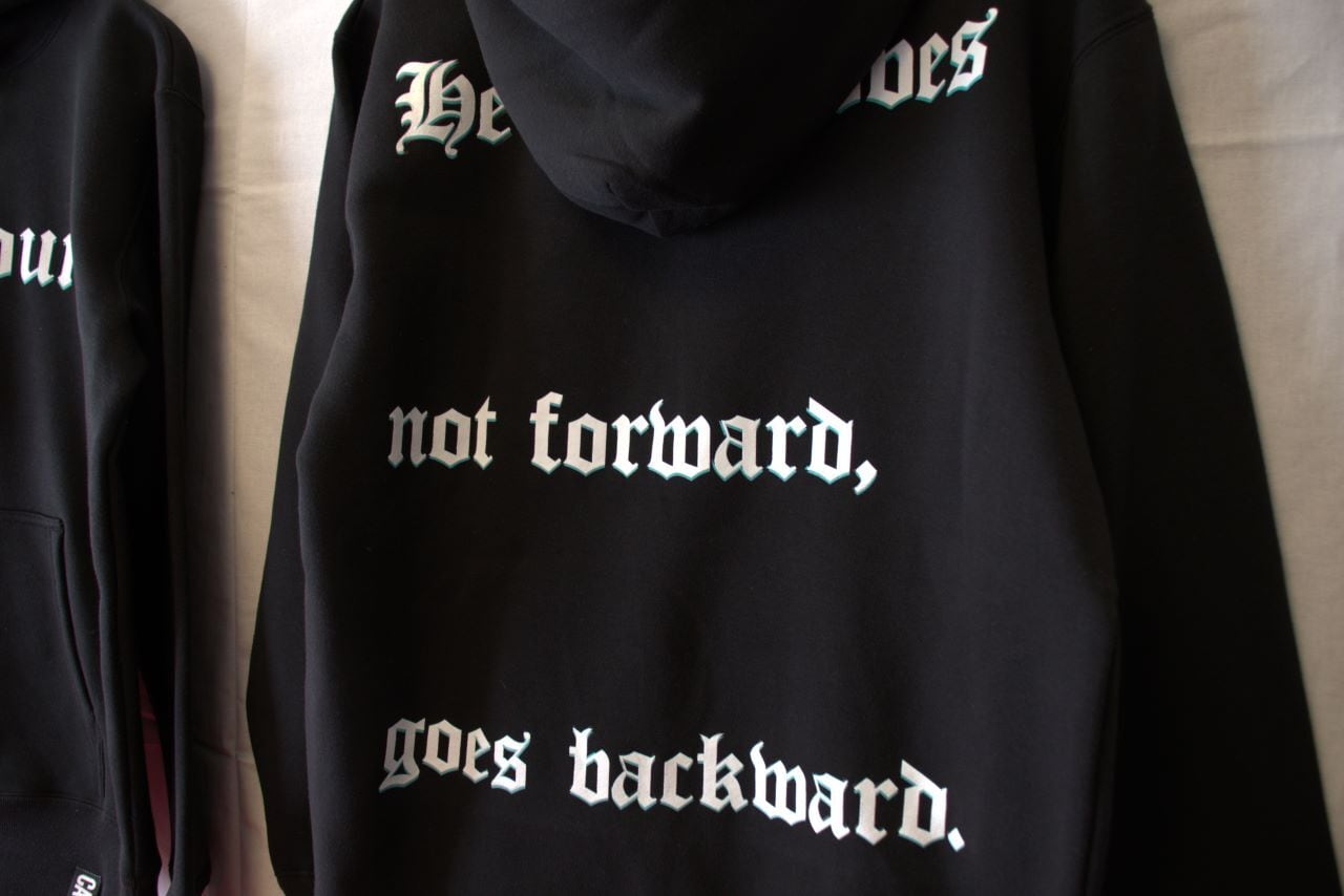 "前進しない者は後退しているのだ"を、バックにプリントしました。