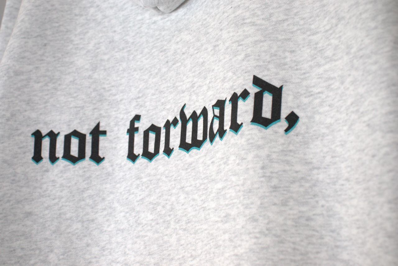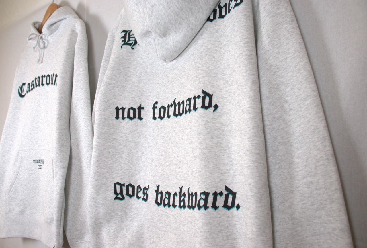 "前進しない者は後退しているのだ"を、バックにプリントしました。